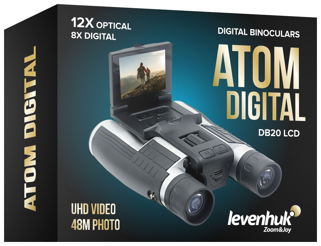 Бинокъл Levenhuk Atom Digital DB20 LCD За наблюдение през деня. Със записващо устройство. Увеличение: 12x (оптично), 1–8x (цифрово). Диаметър на лещата: 32 mm
