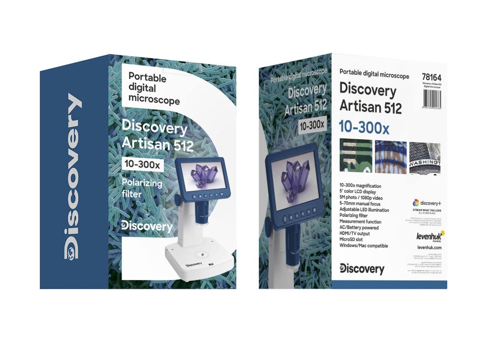 Цифров микроскоп Levenhuk Discovery Artisan 512 USB микроскоп за приложни работи. 5-инчов екран с течнокристален дисплей. Увеличение: 10–300x (с цифрово увеличение: 10–1200x). Цифрова камера: 5 MP